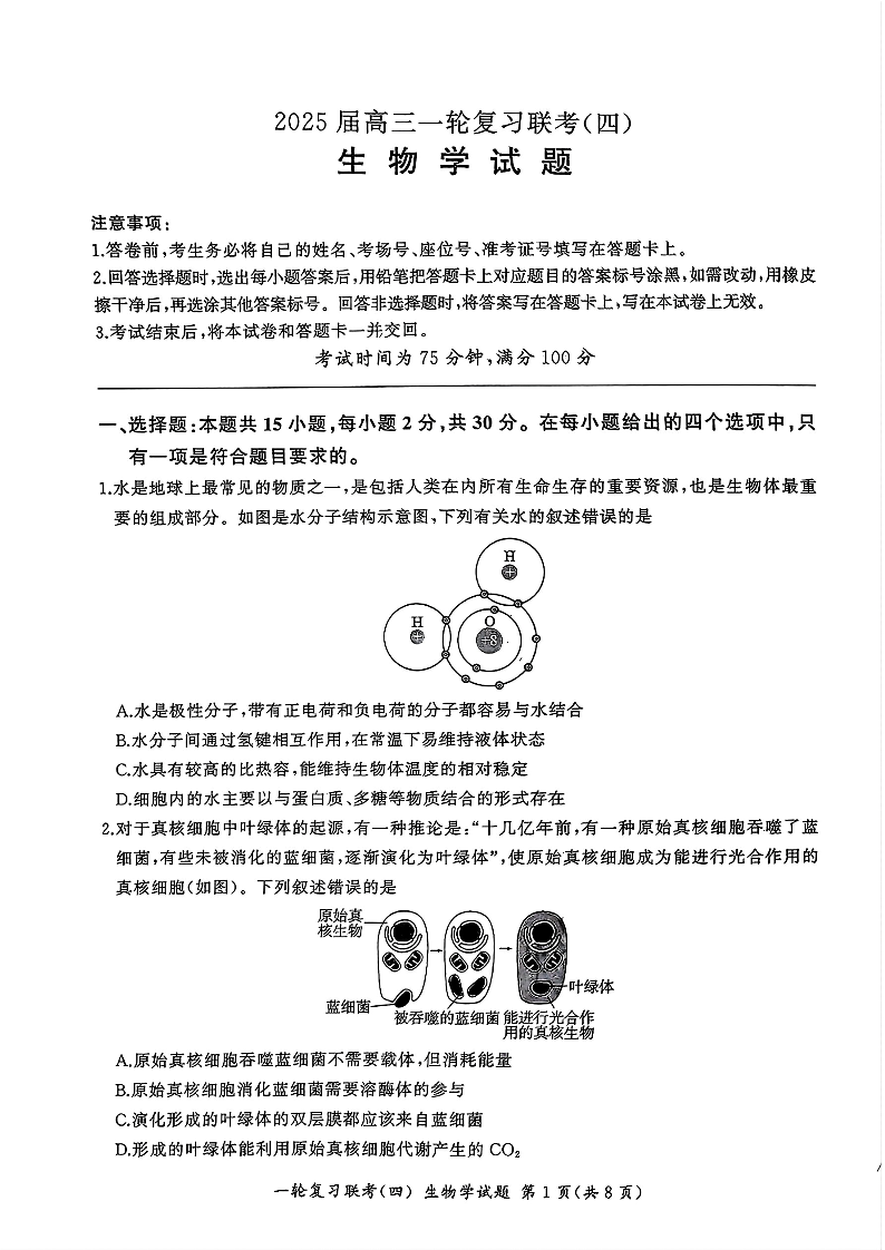 河北省区域高中2025届高三年级一轮复习联考(四)生物