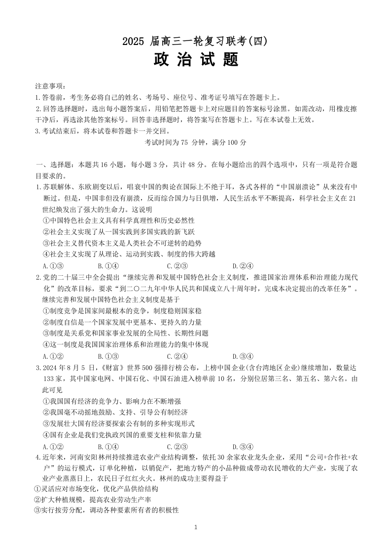 河北省区域高中2025届高三年级一轮复习联考(四)政治