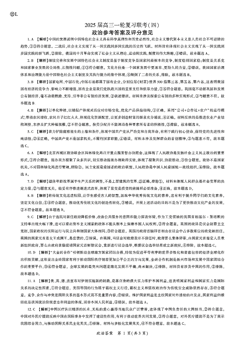 河北省区域高中2025届高三年级一轮复习联考(四)政治答案