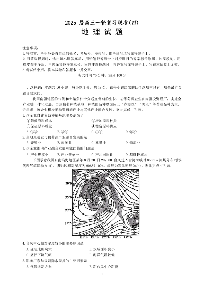 河北省区域高中2025届高三年级一轮复习联考(四)地理