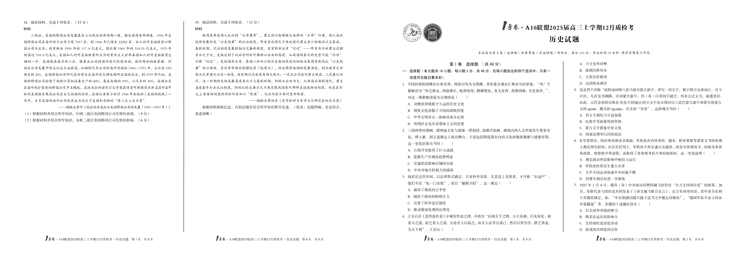 安徽省1号卷•A10联盟2025月高三上学期12月质检考历史