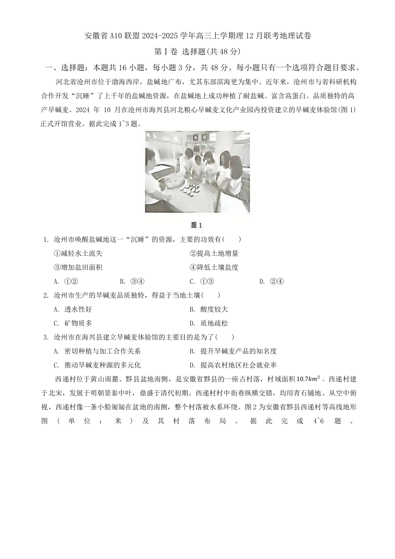 安徽省1号卷•A10联盟2025月高三上学期12月质检考地理