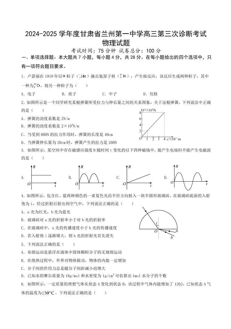 甘肃省兰州第一中学2025届高三上学期第三次诊断考试物理+答案