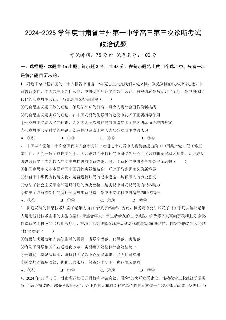 甘肃省兰州第一中学2025届高三上学期第三次诊断考试政治+答案