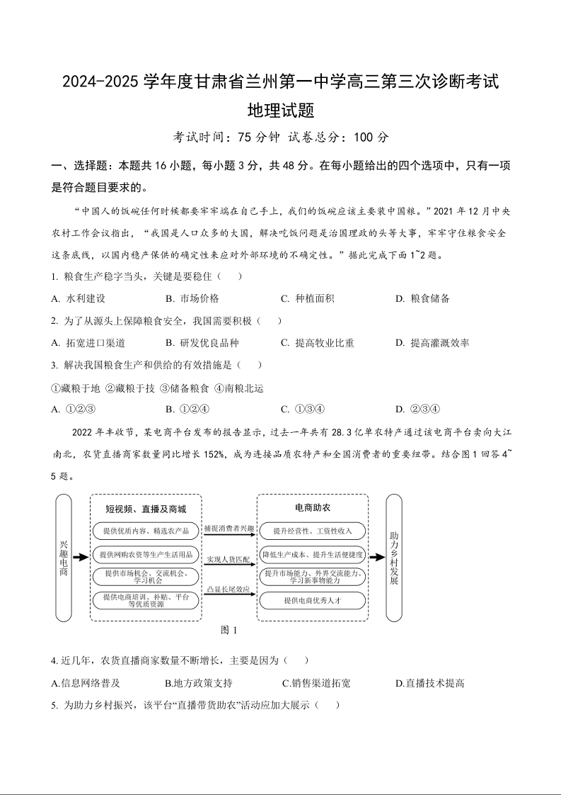 甘肃省兰州第一中学2025届高三上学期第三次诊断考试地理+答案