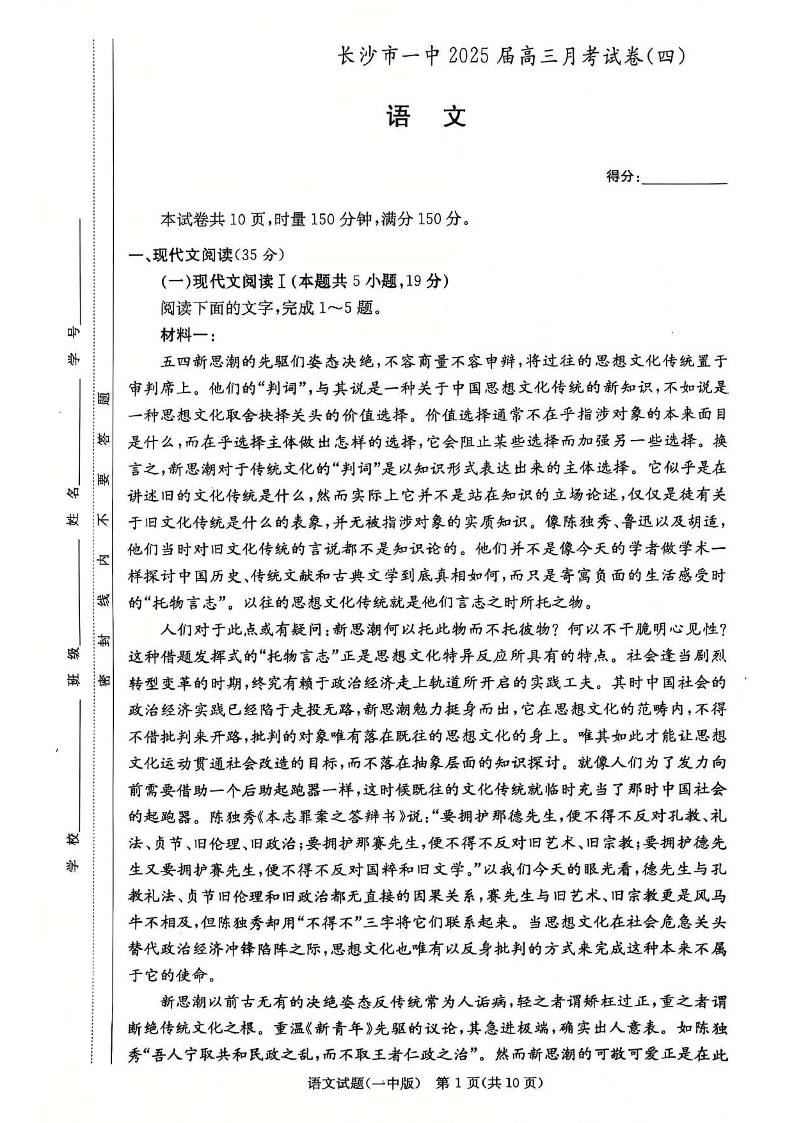 湖南省长沙市第一中学2025届高三上学期月考试卷(四)语文