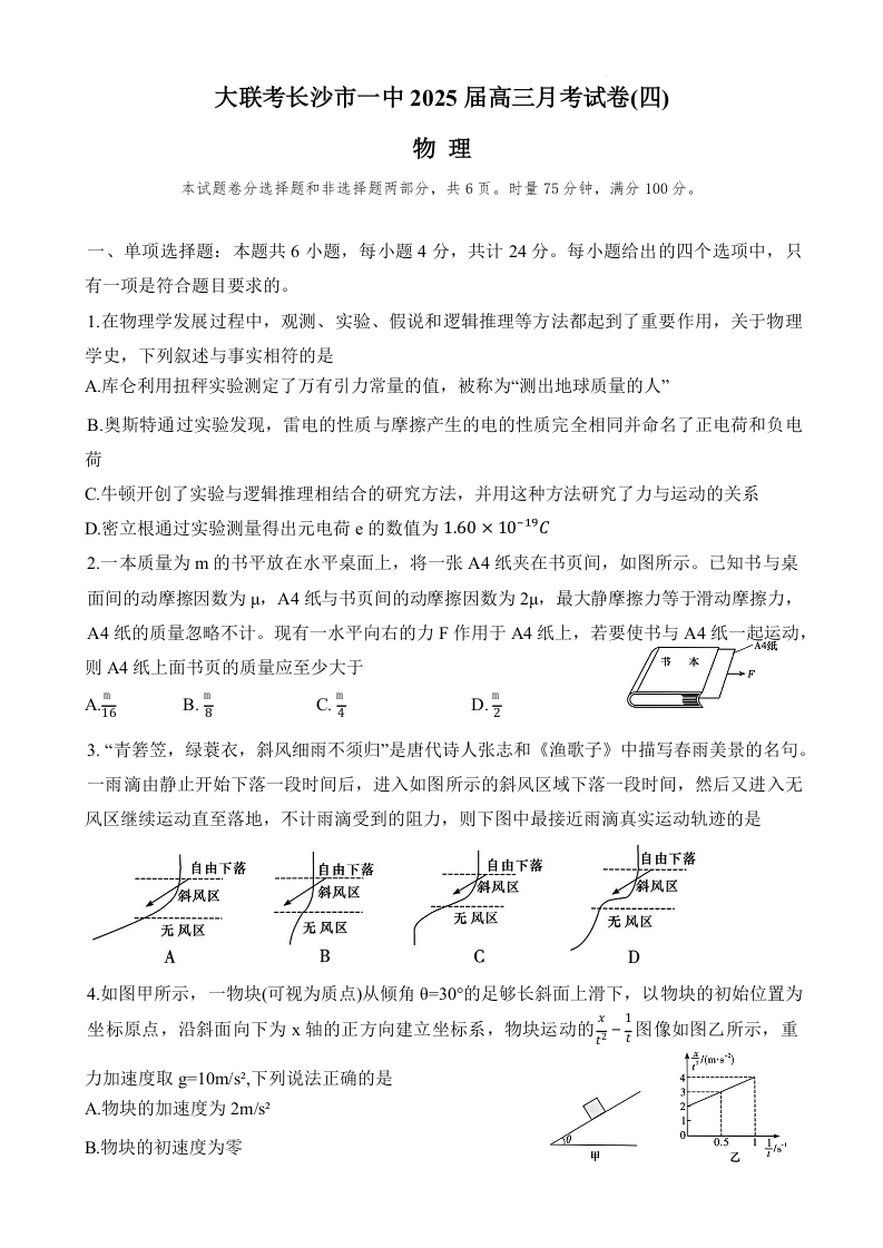 湖南省长沙市第一中学2025届高三上学期月考试卷(四)物理