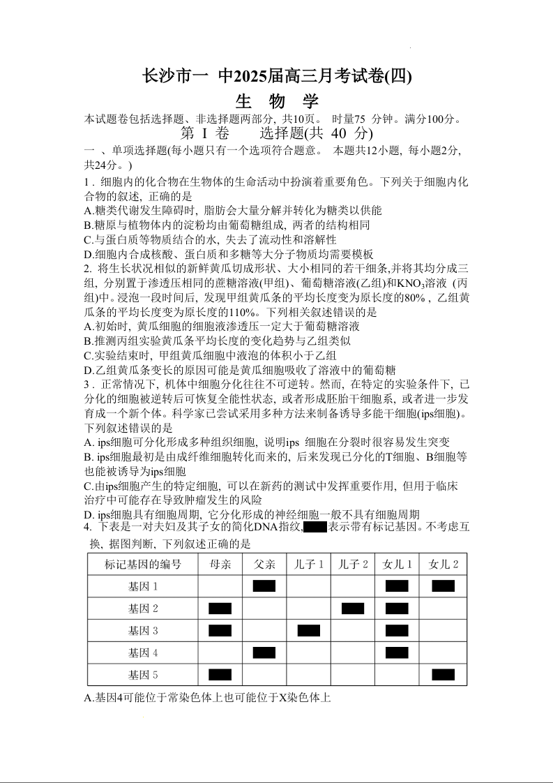湖南省长沙市第一中学2025届高三上学期月考试卷(四)生物