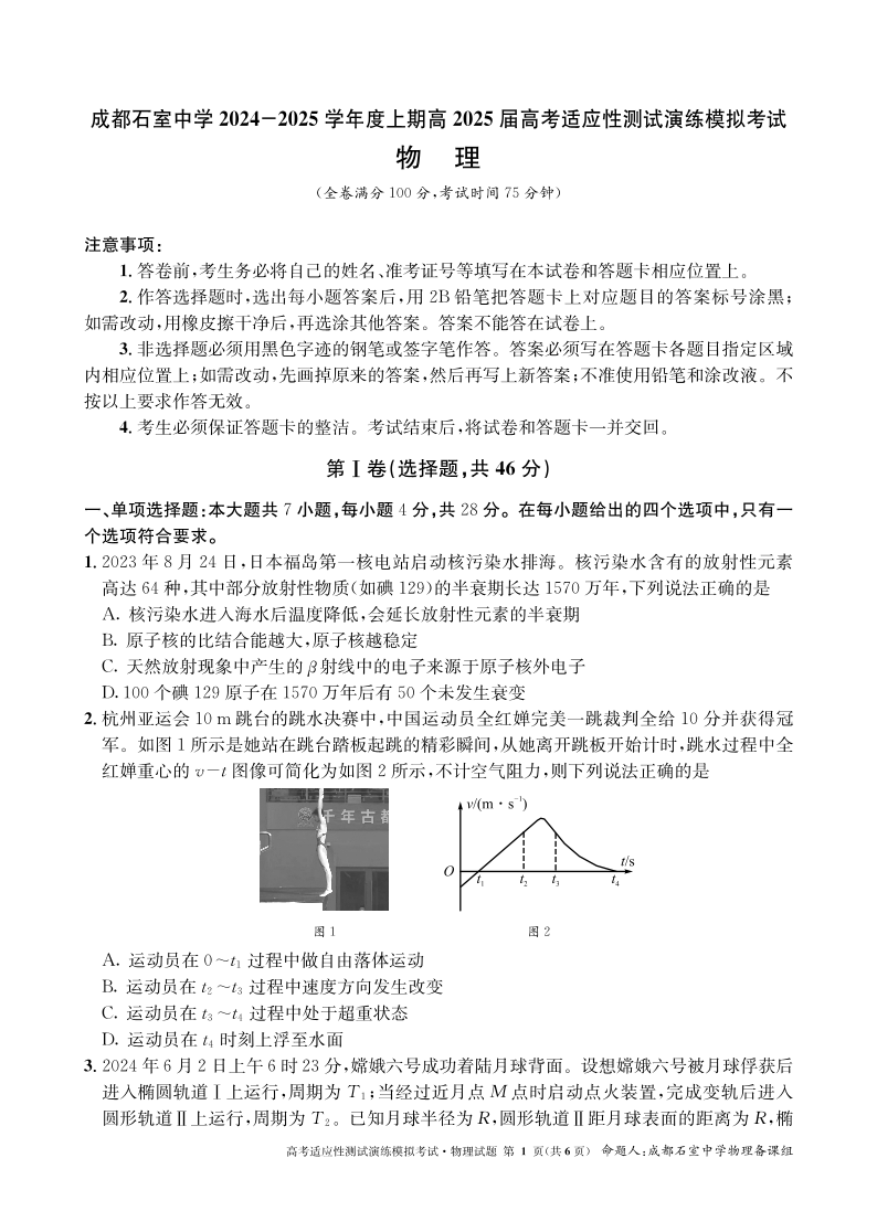 四川省成都市石室中学 2025 年高考适应性测试演练模拟考试物理
