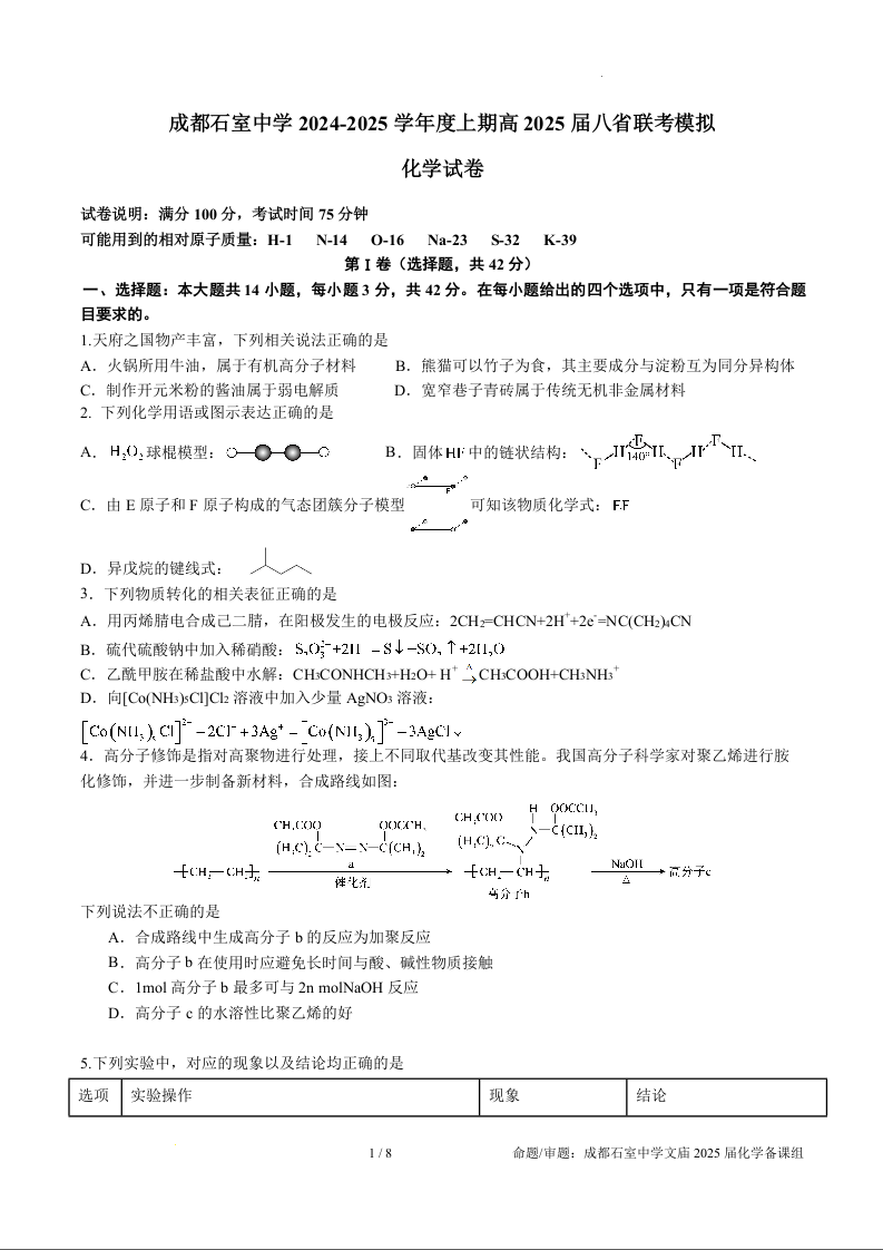四川省成都市石室中学 2025 年高考适应性测试演练模拟考试化学