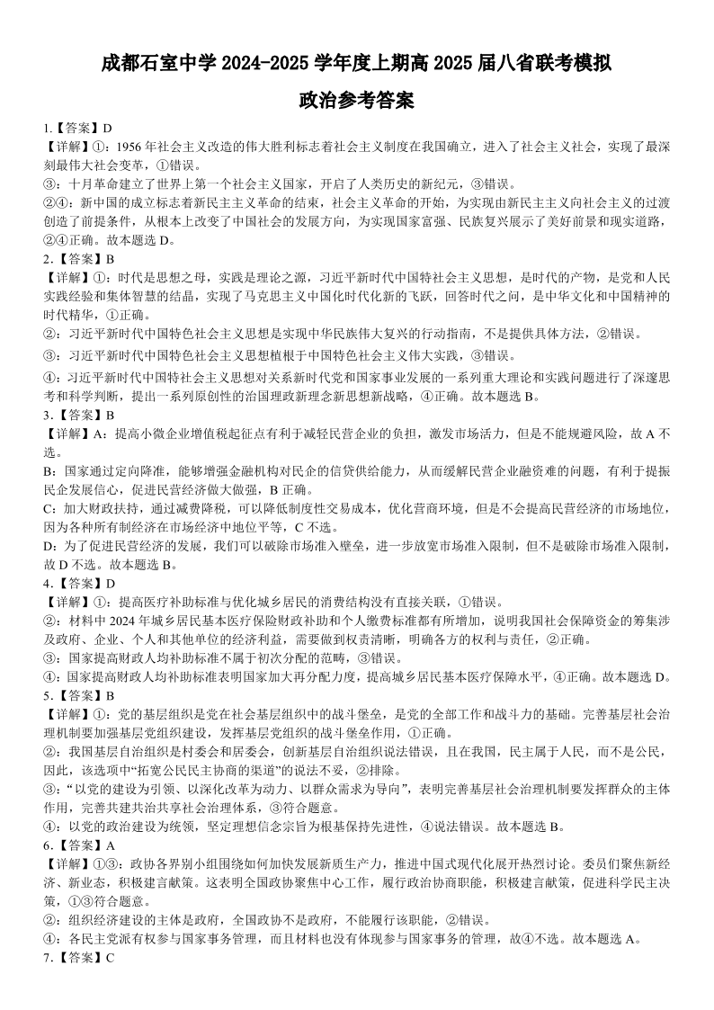 四川省成都市石室中学 2025 年高考适应性测试演练模拟考试政治答案