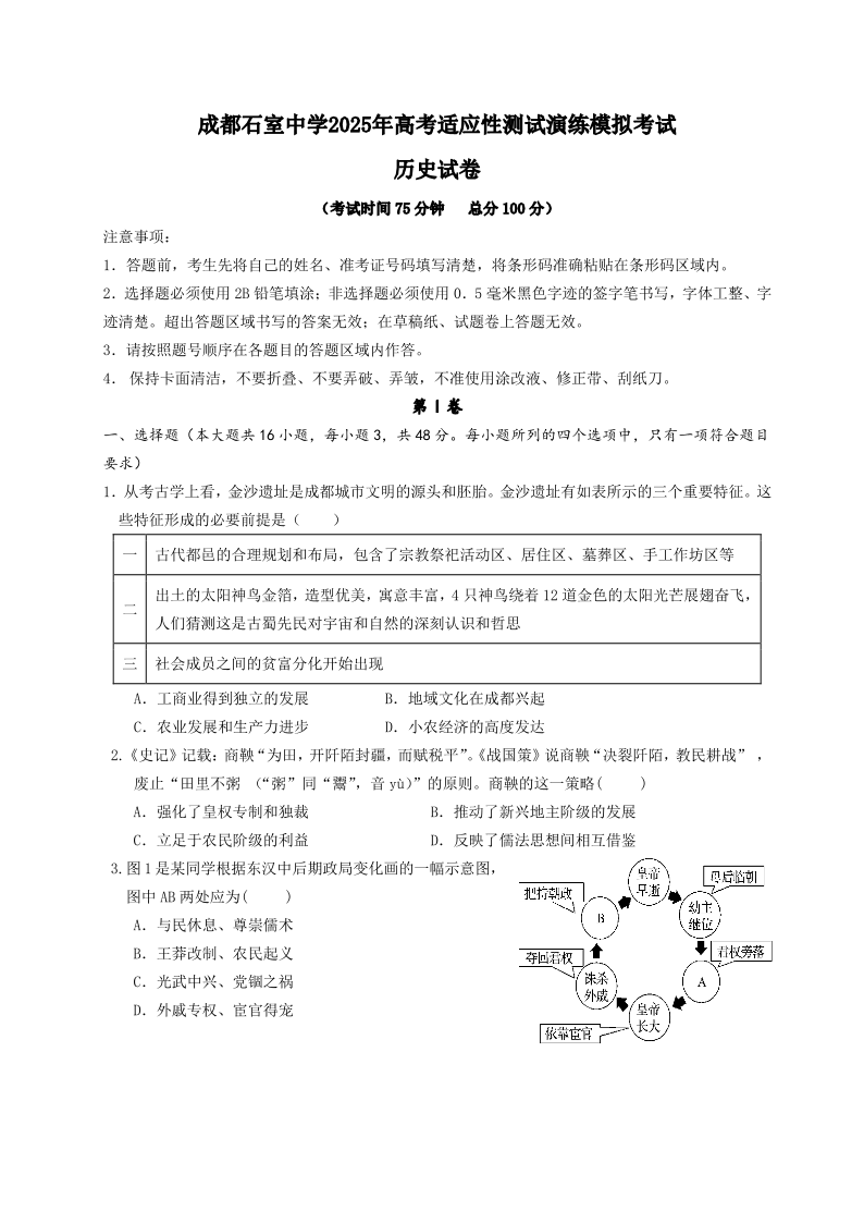 四川省成都市石室中学 2025 年高考适应性测试演练模拟考试历史