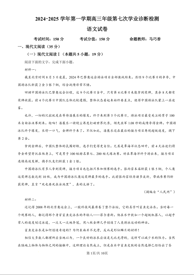内蒙古自治区巴彦淖尔市第一中学2025届高三上学期12月第七次诊断语文(原卷版)