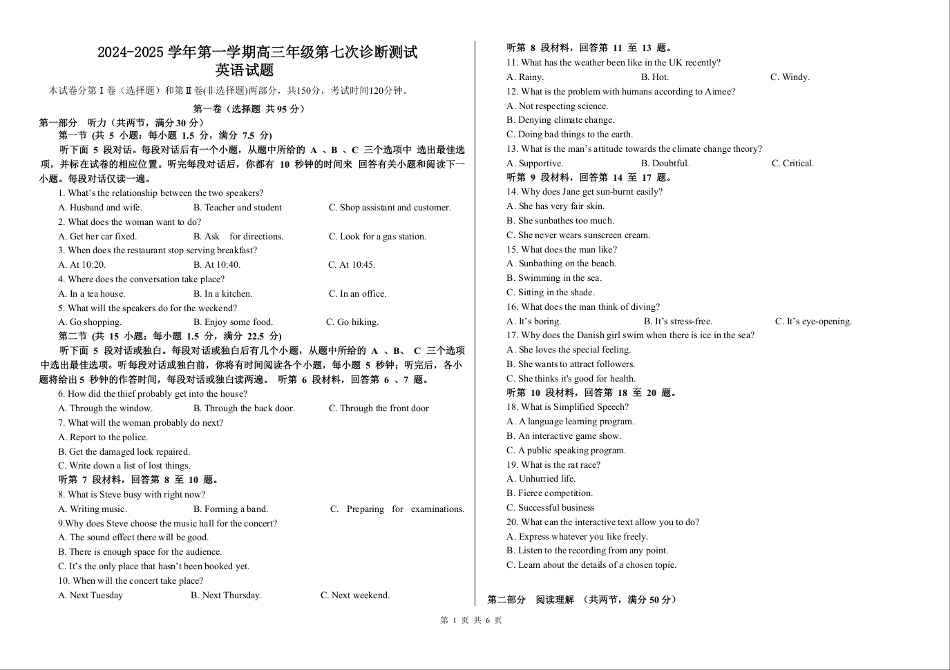 内蒙古自治区巴彦淖尔市第一中学2025届高三上学期12月第七次诊断英语