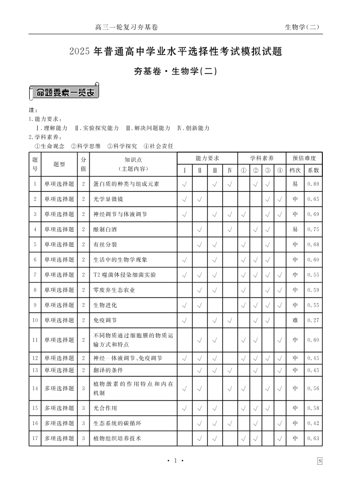 河北省衡水金卷先享题2025届高三一轮复习夯基卷(二)生物答案