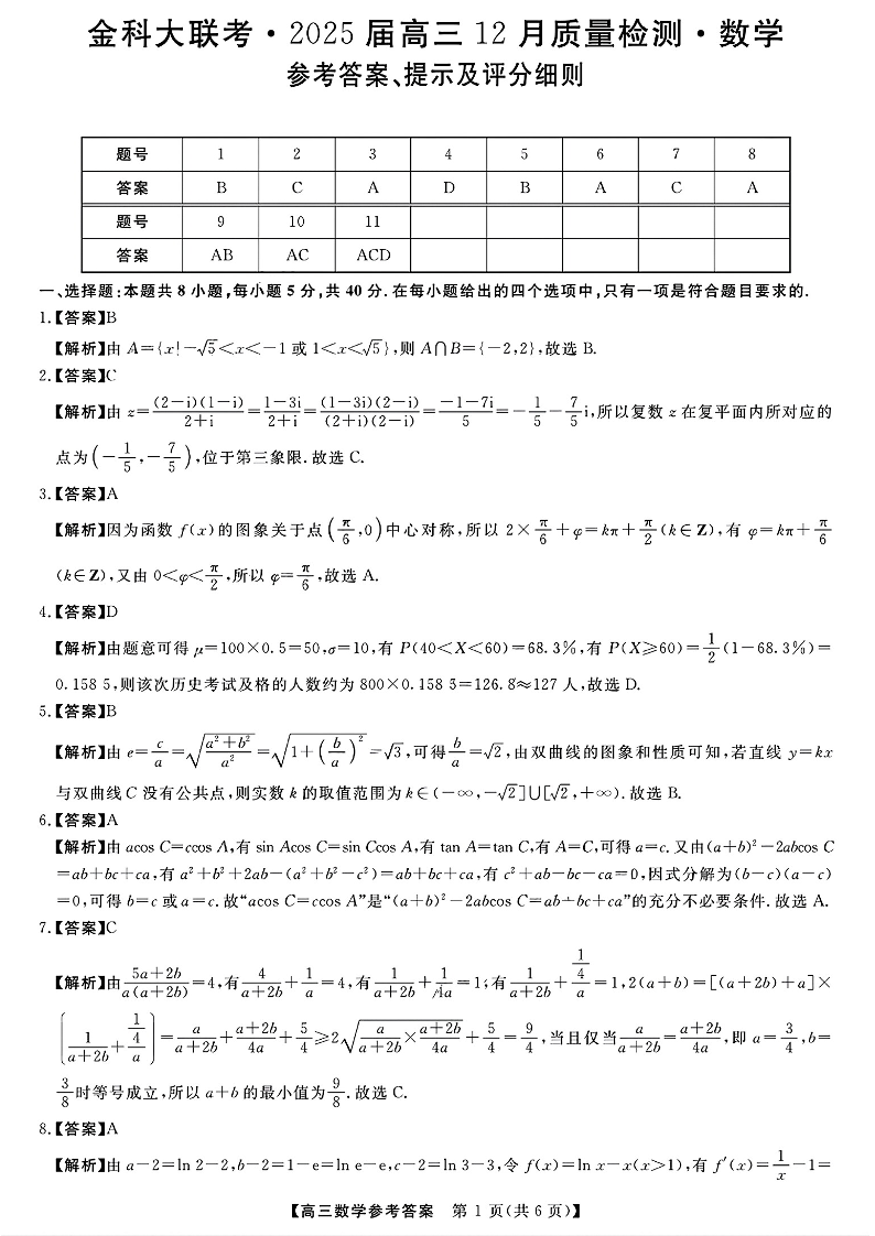 河北省金科大联考2025届高三12月质量检测数学答案