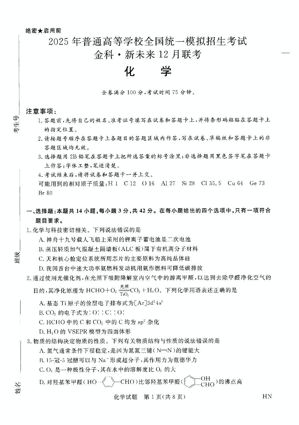 河北省金科大联考2025届高三12月质量检测化学