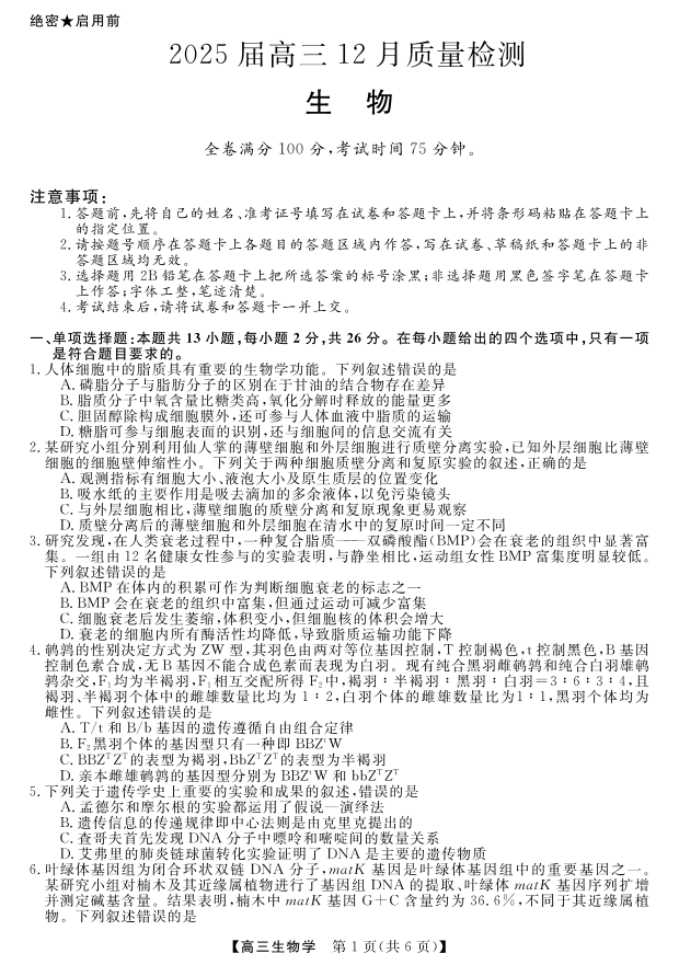 河北省金科大联考2025届高三12月质量检测生物