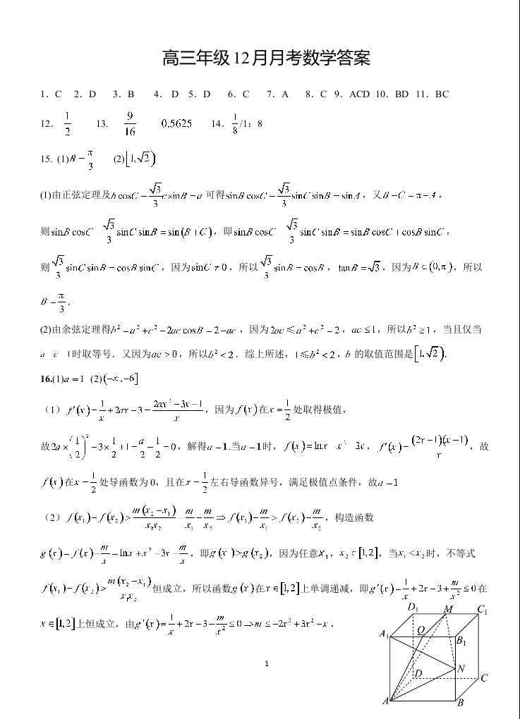 湖北省沙市中学2025届高三上学期12月月考数学答案