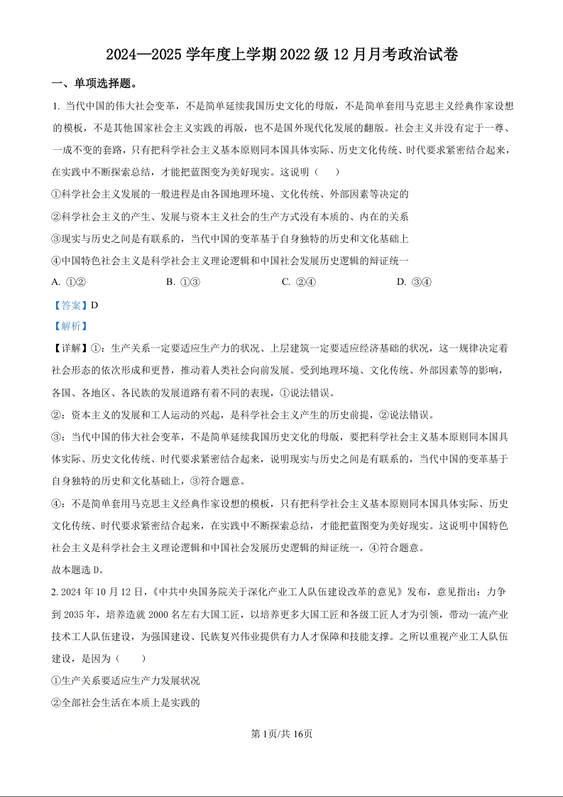 湖北省沙市中学2025届高三上学期12月月考政治(精品解析版)