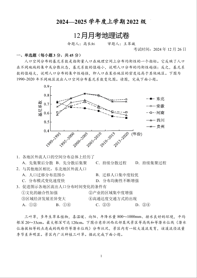 湖北省沙市中学2025届高三上学期12月月考地理+答案