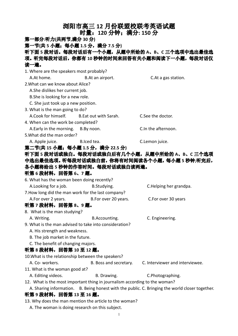 湖南省浏阳市联盟校2025届高三上学期12月联考英语