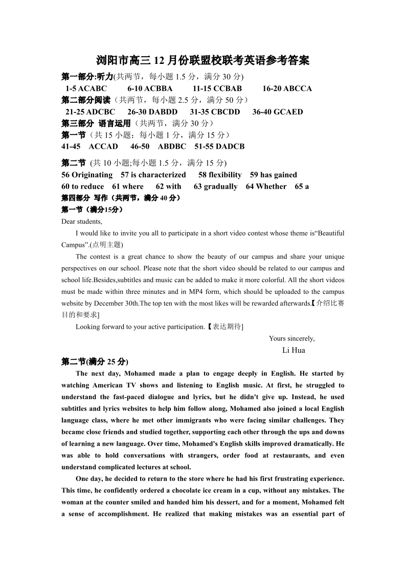 湖南省浏阳市联盟校2025届高三上学期12月联考英语答案
