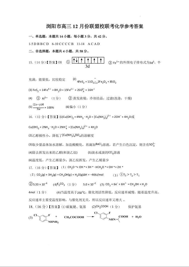 湖南省浏阳市联盟校2025届高三上学期12月联考化学答案