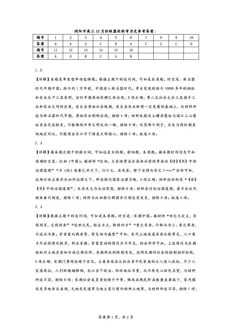 湖南省浏阳市联盟校2025届高三上学期12月联考历史答案