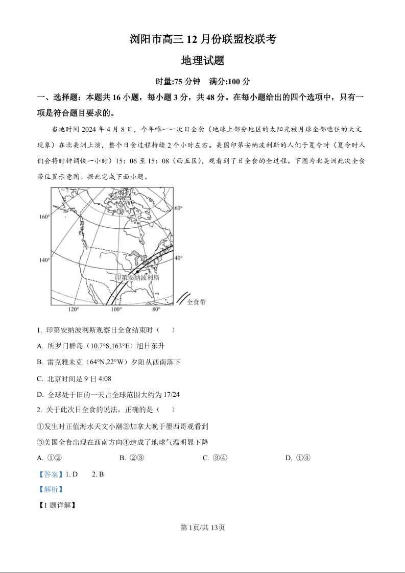 湖南省浏阳市联盟校2025届高三上学期12月联考地理(精品解析版)