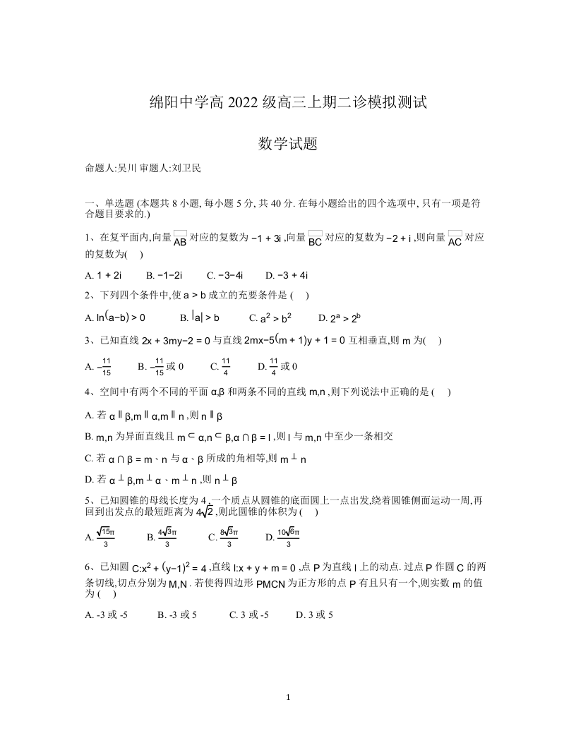 12-29【四川卷】百强校丨四川省绵阳中学2025届高三上学期二诊模拟测试数学+答案