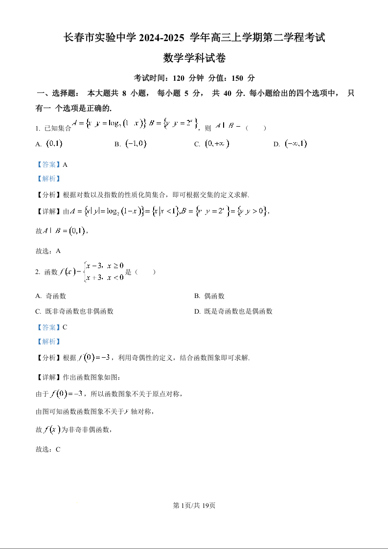 吉林省长春市实验中学2025届高三上学期12月期中考试数学数学(精品解析版)