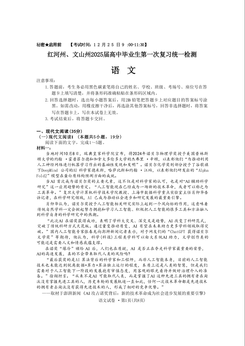 云南省红河州、文山州2025届高中毕业生第一次复习统一检测语文+答案