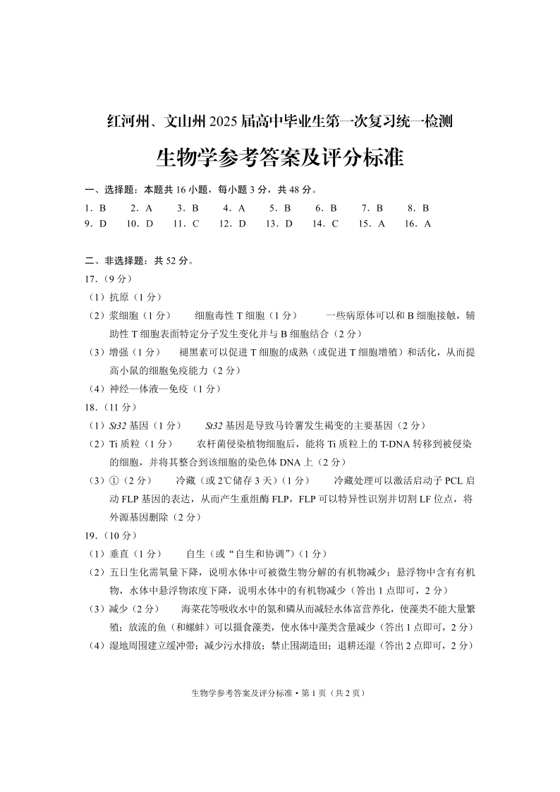 云南省红河州、文山州2025届高中毕业生第一次复习统一检测生物答案