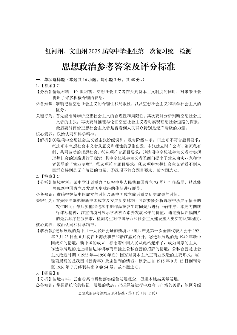 云南省红河州、文山州2025届高中毕业生第一次复习统一检测政治答案