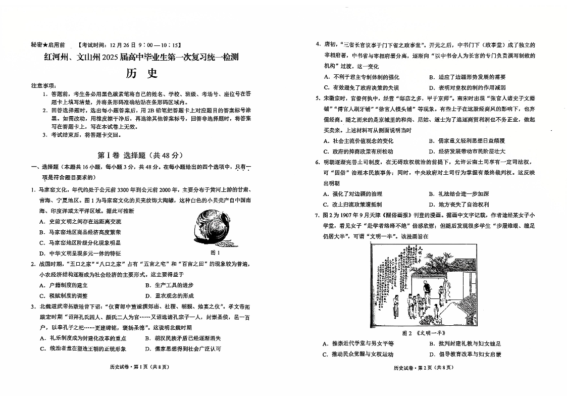 云南省红河州、文山州2025届高中毕业生第一次复习统一检测历史