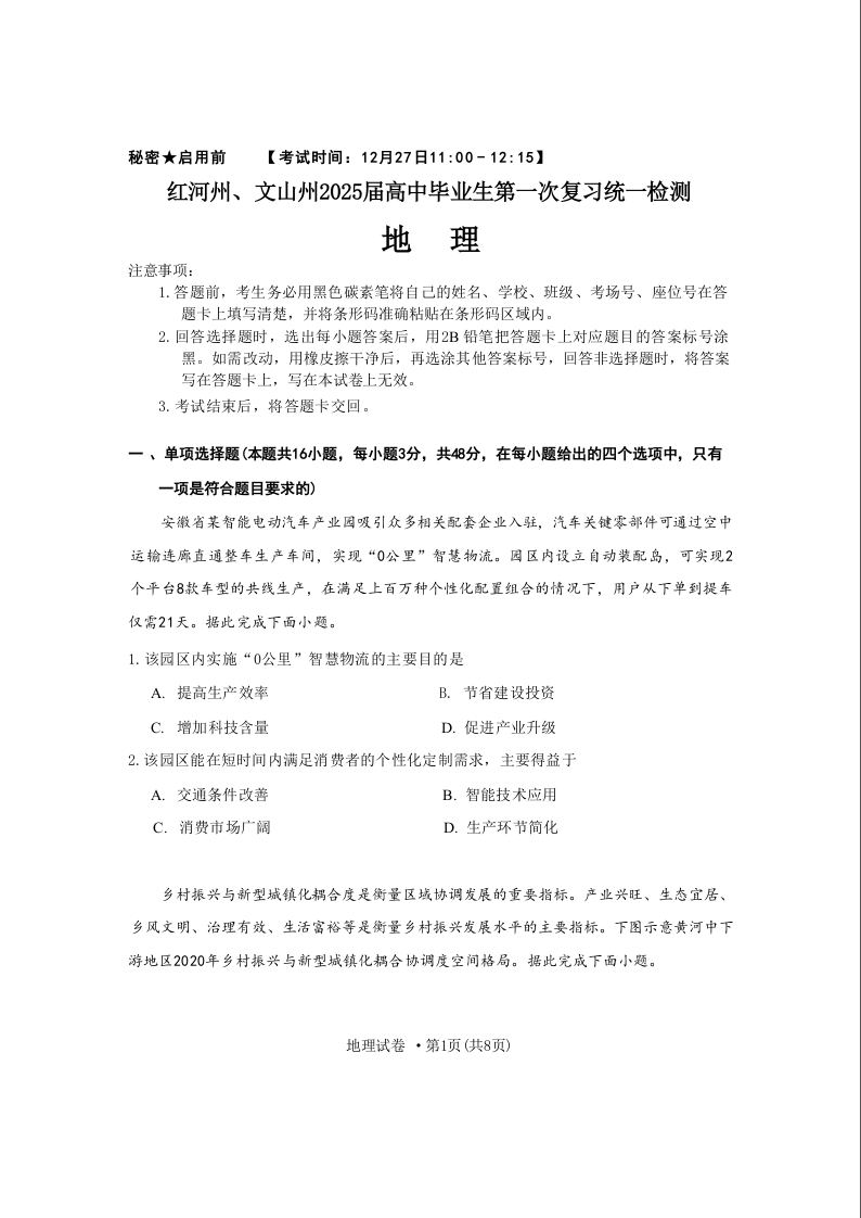 云南省红河州、文山州2025届高中毕业生第一次复习统一检测地理+答案
