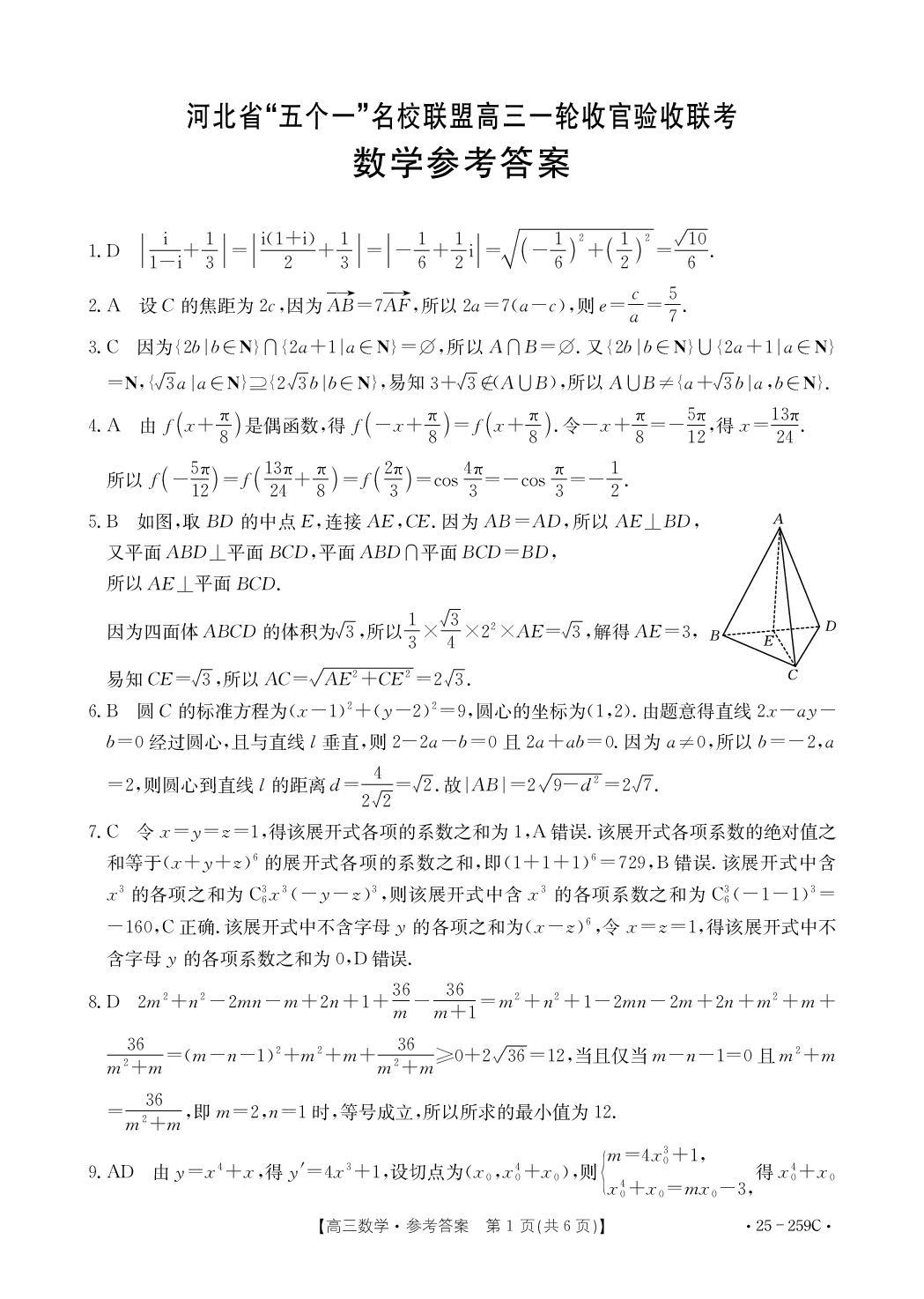 河北省五个一名校联盟2025届高三上学期一轮收官验收暨12月月考数学答案