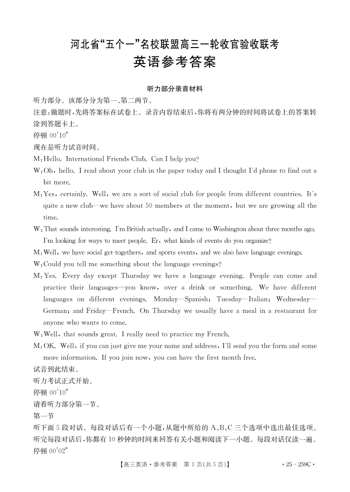 河北省五个一名校联盟2025届高三上学期一轮收官验收暨12月月考英语答案