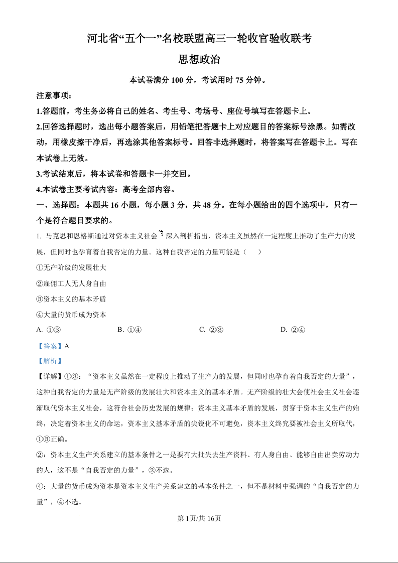 河北省五个一名校联盟2025届高三上学期一轮收官验收暨12月月考政治(精品解析版)