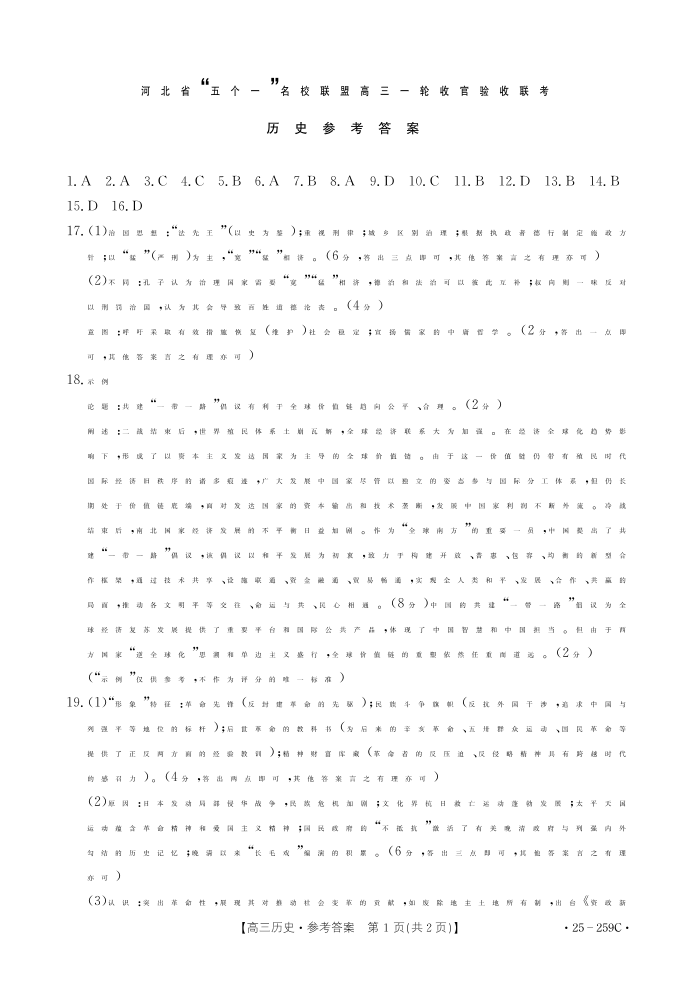 河北省五个一名校联盟2025届高三上学期一轮收官验收暨12月月考历史答案