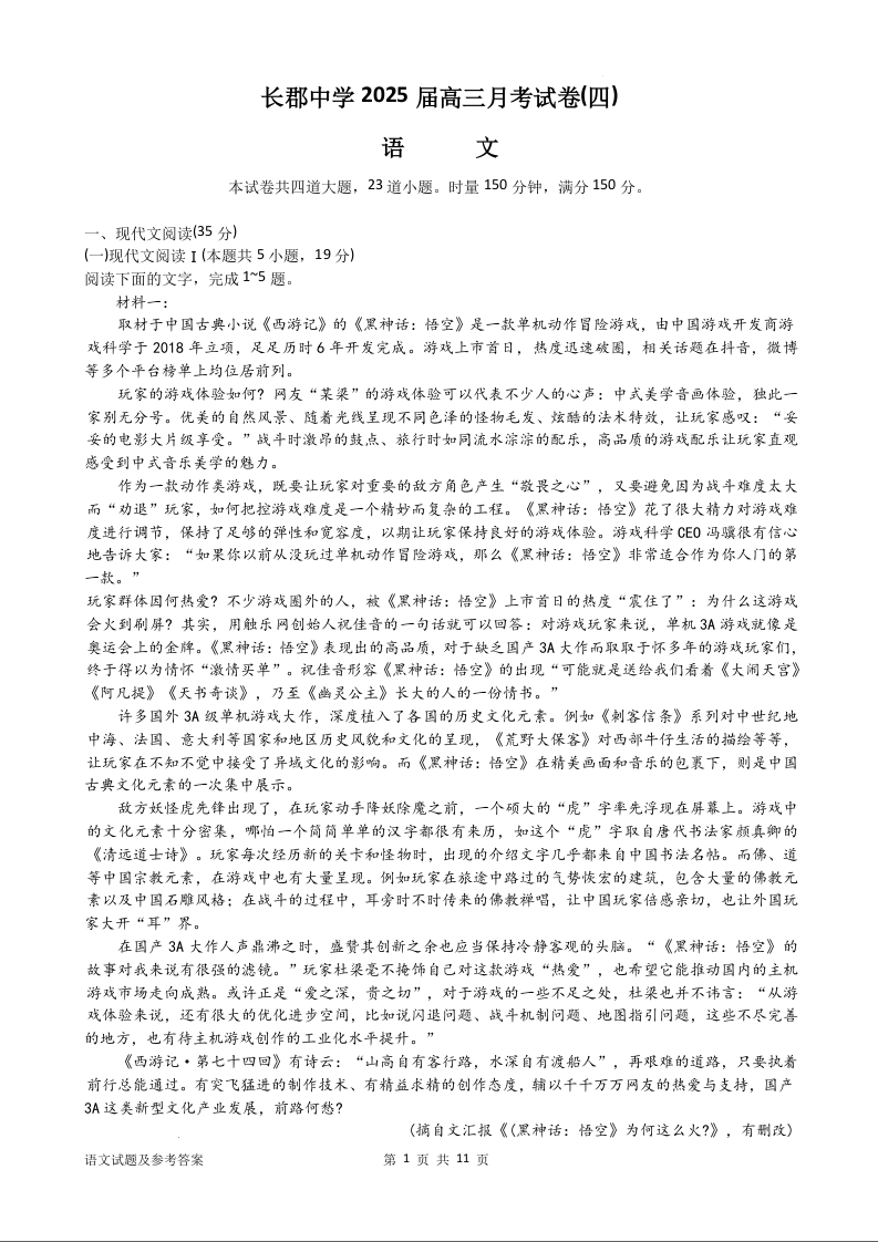 湖南省长沙市长郡中学2025届高三上学期月考(四)语文+答案