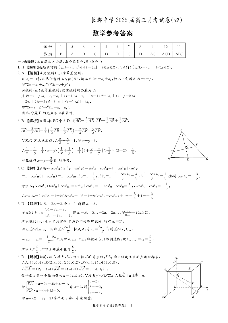 湖南省长沙市长郡中学2025届高三上学期月考(四)数学答案