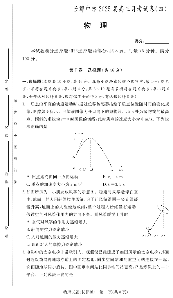 湖南省长沙市长郡中学2025届高三上学期月考(四)物理
