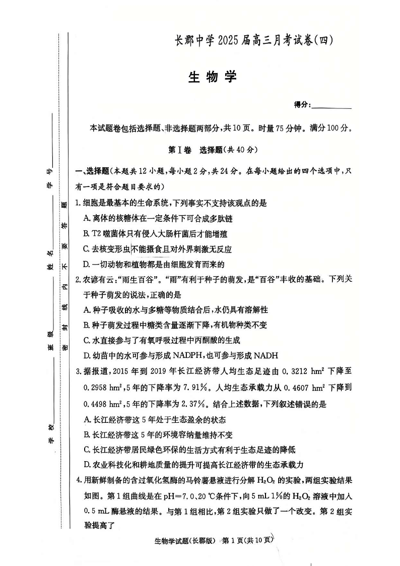 湖南省长沙市长郡中学2025届高三上学期月考(四)生物