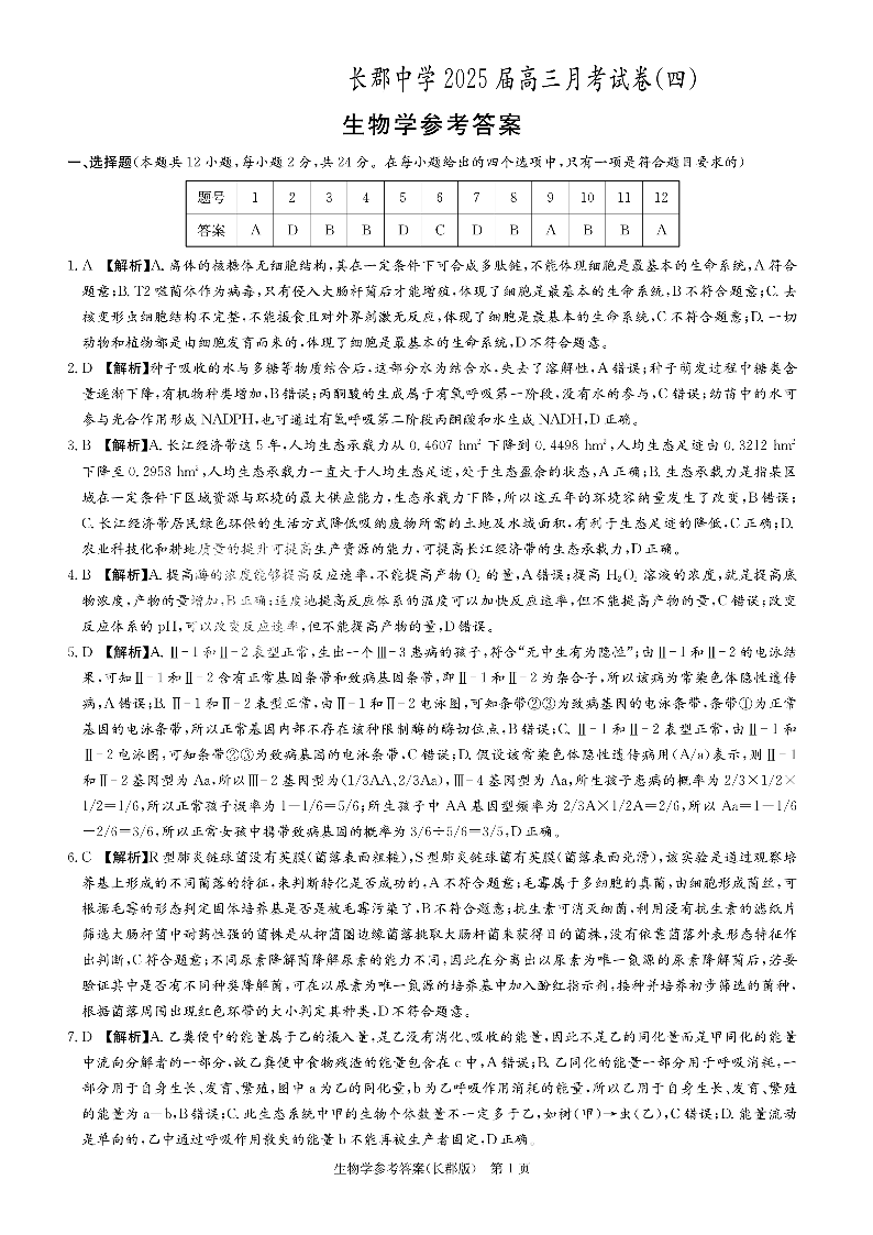 湖南省长沙市长郡中学2025届高三上学期月考(四)生物答案