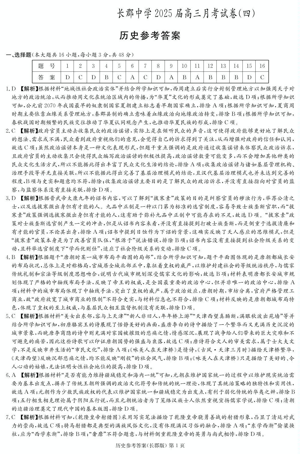 湖南省长沙市长郡中学2025届高三上学期月考(四)历史答案