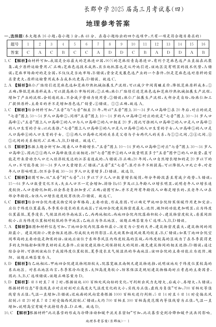 湖南省长沙市长郡中学2025届高三上学期月考(四)地理答案