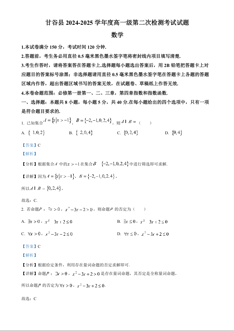 甘肃省天水市甘谷县2024-2025学年高一上学期11月联考数学(解析版)