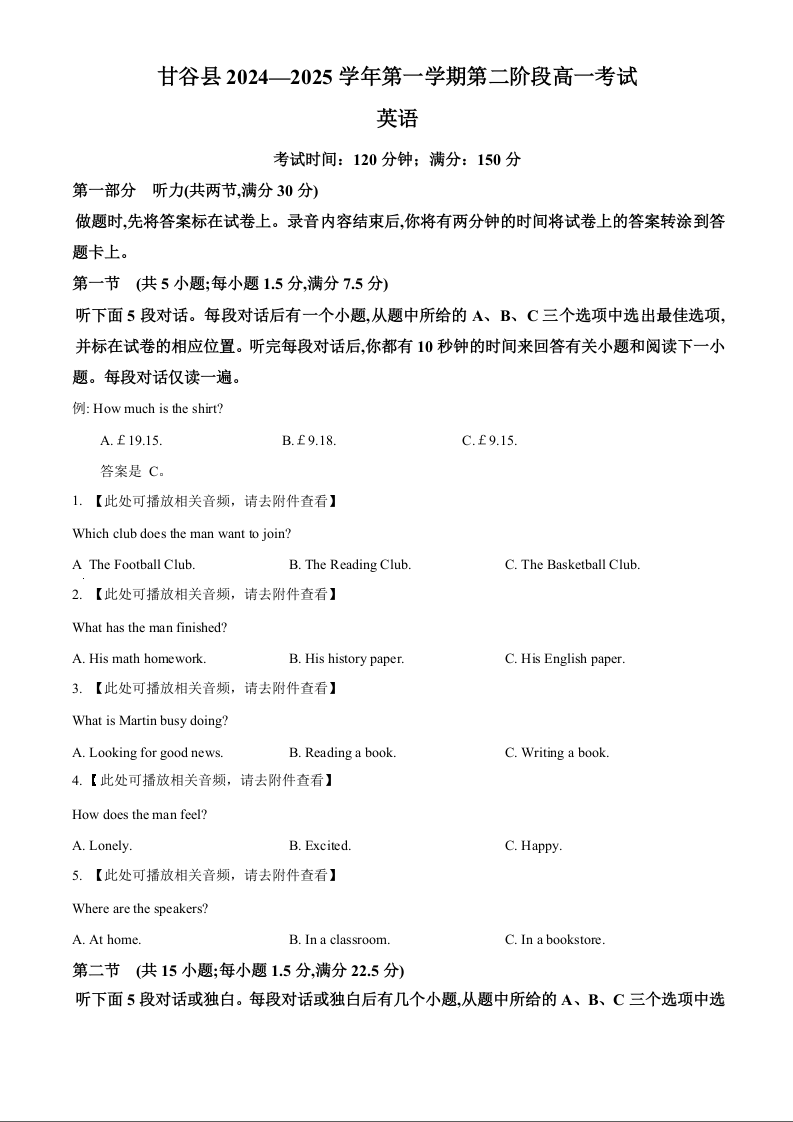 甘肃省天水市甘谷县2024-2025学年高一上学期11月联考英语(原卷版)